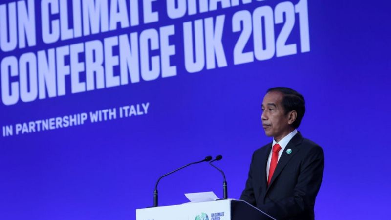 Presiden Joko Widodo menyampaikan pidato terkait perubahan iklim di KTT COP26 di Glasglow, Skotlandia pada Senin, 1 November 2021.